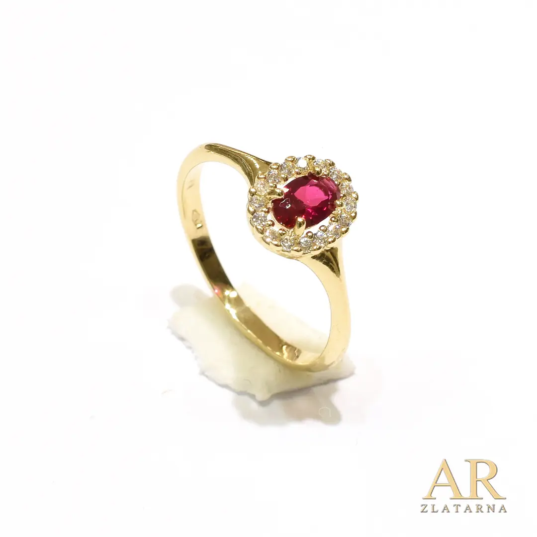 Zlatni prsten sa Crvenim kamenom i cirkonima uokolo